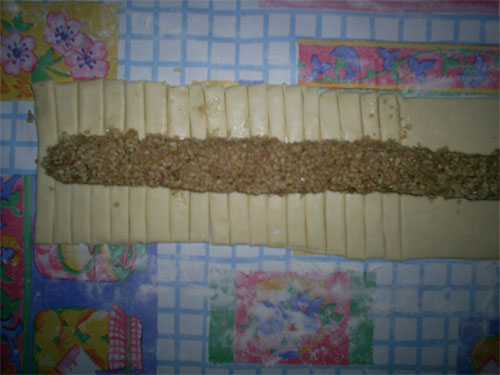 مقادير العجينة توضع بالفرن وتترك الا ان يصير لونها ذهبيوهي ساخنة يوضع عليها القطر او عسل ساخن وتترك لتتشرب قليلا3 مقادير دقيق1 مقدار نشاء مقدار غير كامل من زبدة ذائبة ( ثلاث أرباع لمقدارتقريبا ) ذرة ملح 3بيض ماء + ماء الزهر للعجن </STRONG></SPAN>ملاحظة:</STRONG></SPAN> </STRONG></SPAN></STRONG></SPAN></STRONG></SPAN></STRONG></SPAN> </STRONG></SPAN> بالشتاء يفضل ان يكون الماء دافئا الحشو مقادير لوز او اي مكسرات عندك ثلاث ارباع المقدار سكر قليل من القرفة تخلط المقادير جيدا ويضاف عليها قليلا من ماء الزهرالطريقة في وعاء تخلط كل مكونات العجين وتعجن جيدا الى ان نحصل على عجينة متماسكةتترك العجينة لمدة ساعة لترتاح قبل بداية العمل عليها نفرد قطعة العجينة على شكل مستطيل وتوضع الحشوة بالوسط ![]() ![]() تم نبدأ التظفير كما يلي </STRONG></SPAN> ![]() ![]() </STRONG> </SPAN> |