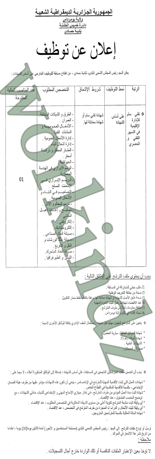 إعلان التوظيف بلدية حمادي دائرة خميس خشنة ولاية بومرداس جانفي 2017