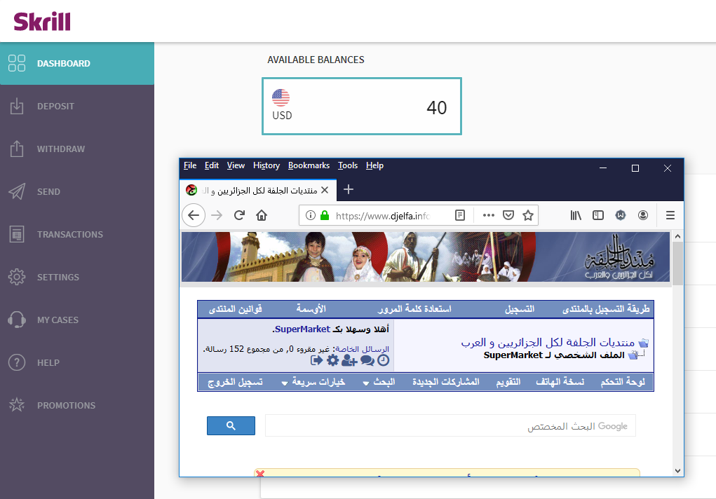 متوفـــر مبلغ 40 دولار سكريل Skrill للبيع دفعة واحدةمقابل CCP الدفع يكون بعد رفع الوصل و التأكــــد من مركز الــبريـد أو من موقعه الإلكتروني أو عبر تلقي رسالة نصية من CCP ســعر البـيع: 1$ دولار= 182 دج (ثابت) المبلغ كاملا ب 7280 دج العمولة يتحملها الشاري إرسال معلومات الدفع يكون عن طريق المشــــرف ![]() بيانات الدفع : SAIHI Abderrahmane ccp N: 5976224 clé: 67
