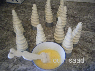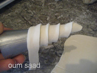 لما تختمر نحلها بالحلال سمك 05 مم ثم نقطعها شرائط ماشي عراض يكونو رقاق و نلفهم على القمع حتى نكمل لعجينة نستفهم في بلاطو مدهون بالزيت و ندهنهم بالبيض مخلط بشوي قهوة و نرش الجنجلانية او سينوج و نشعل من تحت ثم من لفوق
