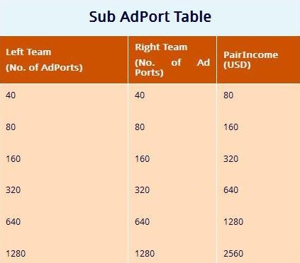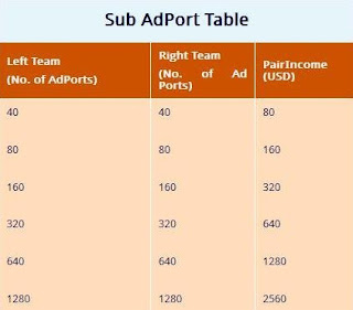 مثلا نفترض ان your sponsor هو انا. اذا سجل شخص معي علي اليمين ثم جاء شخص اخر و سجل معي ايضا علي اليمين يصبح بالتالي تحت الشخص الأول في الخانة B و كذلك هو ريفيرال مباشر لي و لكن ريفيرال غير مباشر(spill over) للشخص الأول و اذا جاء شخص ثالث علي اليمين عن طريقي ايضا يصبح في الخانة D و هكذا.... و نفس الحال أيضا بالنسبة لليسار. مثال تمهيدي: اشتري فريق اليمين عندك اجمالي 4 اسهم اما فريق اليسار اشتري 5 بالتالي تأخذ 8$ (دولار علي كل سهم) كأن الفريق اليسار اشتري 4 فقط حتي يشتري اليمين السهم الخامس فتأخذ 2$ زيادة. و ايضا اذا اشتري بعد ذلك فريق اليسار 5 اسهم اخرين اما فريق اليمين لم يشتري اي سهم بعد ذلك, لن تأخذ اي ربح علي اسهم فريق اليسار الاخري و لكن طبعا نادرا الحدوث هذا مثال فقط للفهم. الشرح ده يعتبر كافي كمبتديء لو انت فهمت لحد كده كويس جدا القادم اكثر تفصيلا و لكن يعتمد علي فهم الشرح اللي فوق. Main ADport table: كل اول عشرة اسهم مشتراه من حساب شخصي واحد (ريفيرال واحد)تحسب في الMain ADport و ارباحها هكذا: Sub ADport table: اي عدد من الاسهم مشتراه بعد اول عشرة اسهم لكل عضو تحسب في الSub ADport و ارباحها هكذا: