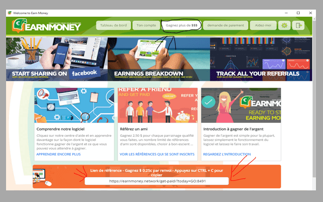 نعم أخي و هي عبر الريفرال أو دعوة الأصدقاء ، كيف ذلك ؟ تقوم بالذهاب إلى Gagnez plus de ثم تأخد الرابط و ترسله إلى أصدقائك أو تنشره في المجموعات ، و هذه طريقة سريعة للربح ، فكلما تسجل أحد ما عن رابط دعوتك ربحت أنت 0,25 دولار ، أي 4 أشخاص=1دولار ، و أيضا إذا وصل أحد ما إلى 20 دولار ستربح أنت 2,5 دولار ، والصورة توضح كيفية نسخ رابط دعوتك