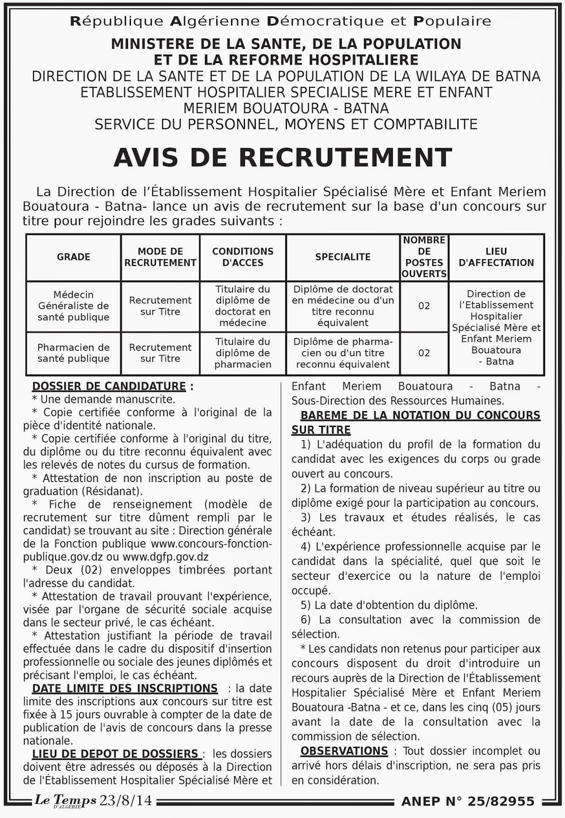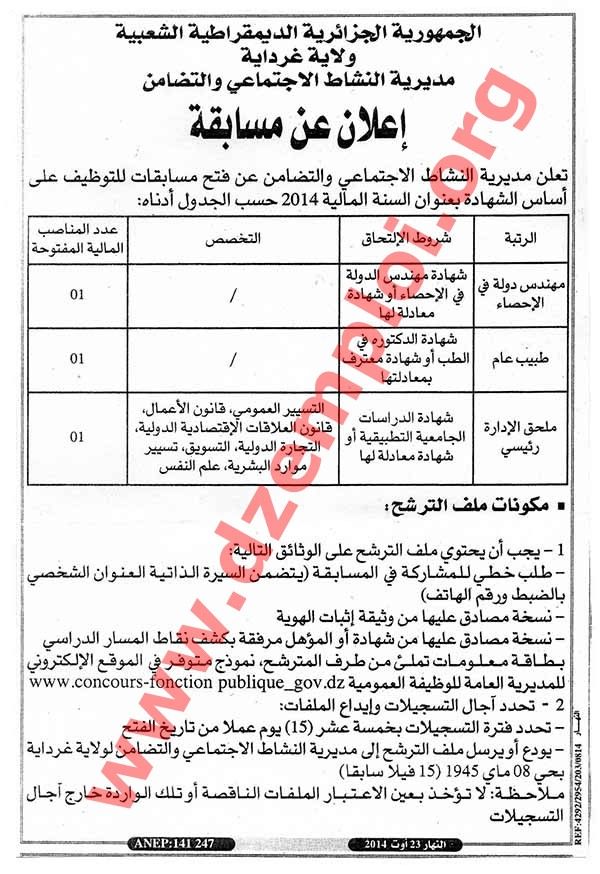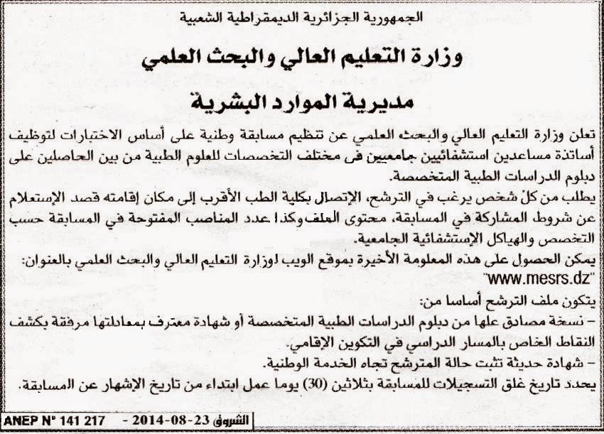 إعلانات التوظيف الصادرة في الوظيفة العمومية الصادرة في الجرائد اليومية الخاصة بشهر أوت 2014