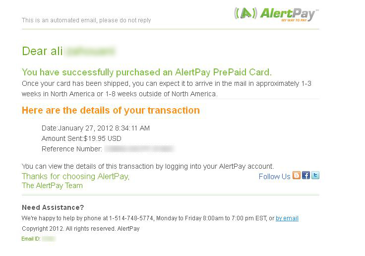 أنظر في قائمة البريد الغير مرغوب فيه السبام فربما يكون هناك و إن لم تجده فراسل الدعم. أنا البارحة دفعت مبلغ البطاقة و أرسلت الوثائق، من بعدها أرسلوا لي إيمايل يؤكد دفعي و إستلامهم للمبلغ في إنتظار التأكيد. و بعد عدة ساعات تلقيت بريد آخر يؤكد أنه تم قبولي و سيرسلون لي البطاقة. هذا هو محتواه Hello Mr. ................., Thank you for your reply. My name is Jesus and I am contacting you on behalf of the AlertPay Compliance KYC (know your customer) Department. We have reviewed your documents and it is our pleasure to inform you that your application for AlertPay Pre paid Debit card has been approved. Thank you for your cooperation and understanding. Best Regards, Jesus للذكر رفعت لهم نسخة عن رخصة السياقة من الجهتين وفاتورة دفع حقوق الأنترنت باسم أبي. |