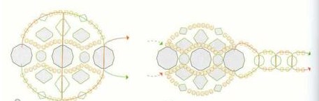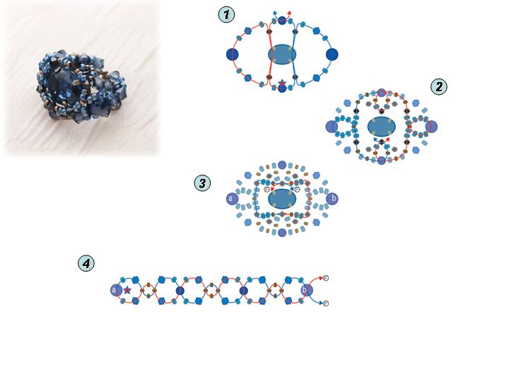 اتمام العمل على هذا النحو - إضافة خرزة رقم 15 ، ننتقل من خلال رقم 7 ، إضافة خرزة رقم 16، ننتقل من خلال رقم 5 ، إضافة خرزة رقم 17 ، ننتقل من خلال الرقم 3 ، إضافة خرزة رقم 18 ،ننتقل من خلال رقم 1.وتكون هذه نهاية الصف الثانى الخاص بك،ويكون على كل الخاتم بنفس الطريقة وعلينا العمل بدقة وتركيز ويكون سحب الخيط برشاقة كي لا يتم عمل عدة عقد لدينا.