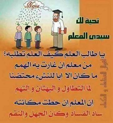 السلام عليكم سادتي.لما يستعلي المتعلم يشمئز العلم و لا يثبت المعلم. ألا نتذكر كيف تعلمنا؟ هيبة حقيقية للمعلم أنتجت قدرات تعلمية رائعة للتلميذ. |