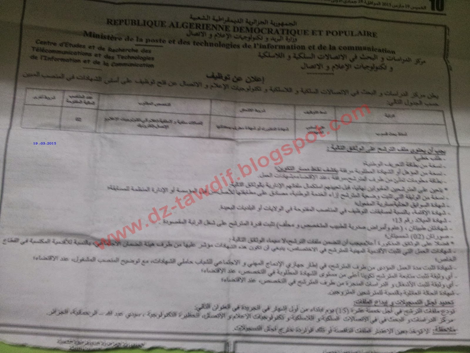 علان توظيف مركز الدراسات و البحث في الإتصالات السلكية و اللاسلكية و التكنولوجيا 19 مارس 2015 |