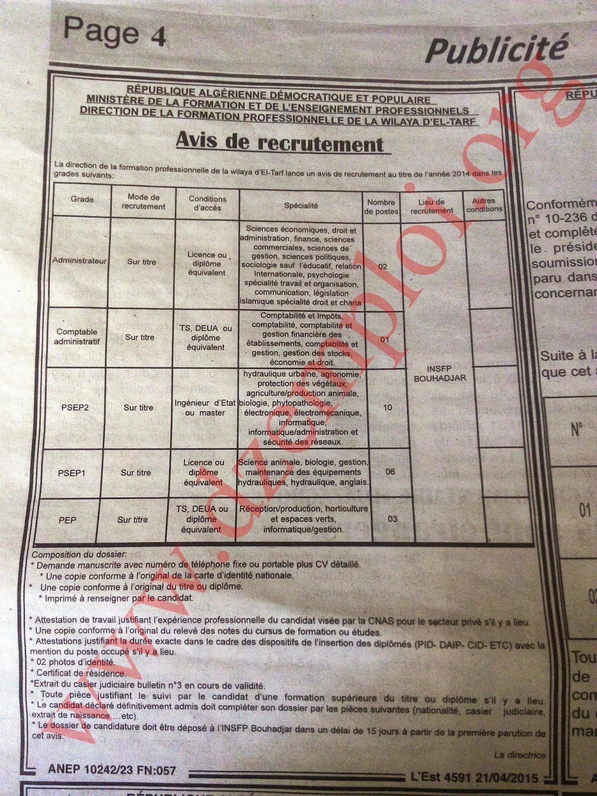 إعلانات التوظيف الصادرة في الجرائد اليومية الخاصة بشهر أفريل 2015