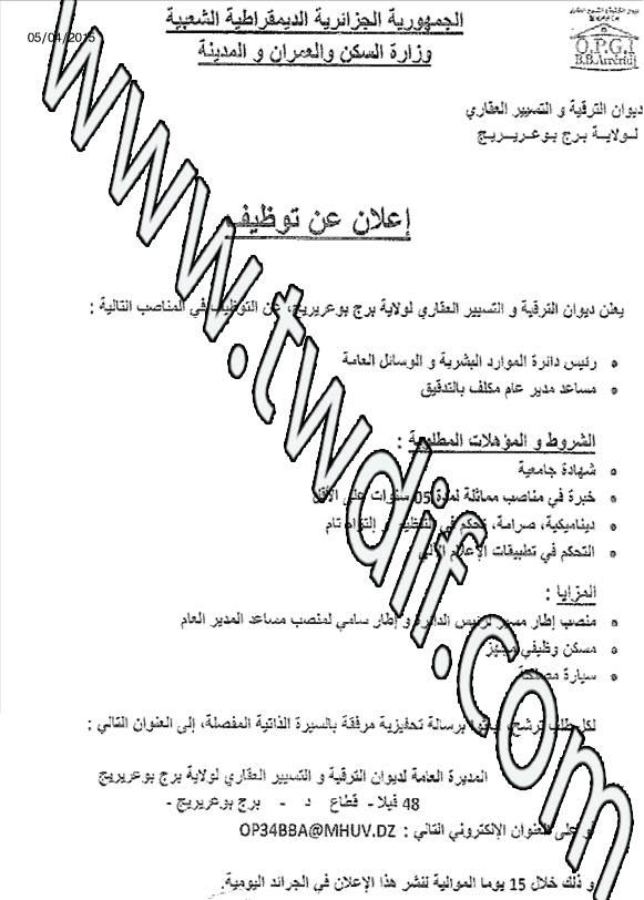 إعلان عن توظيف في ديوان الترقية والسيير العقاري ولاية برج بوعريريج أفريل 2015 |
