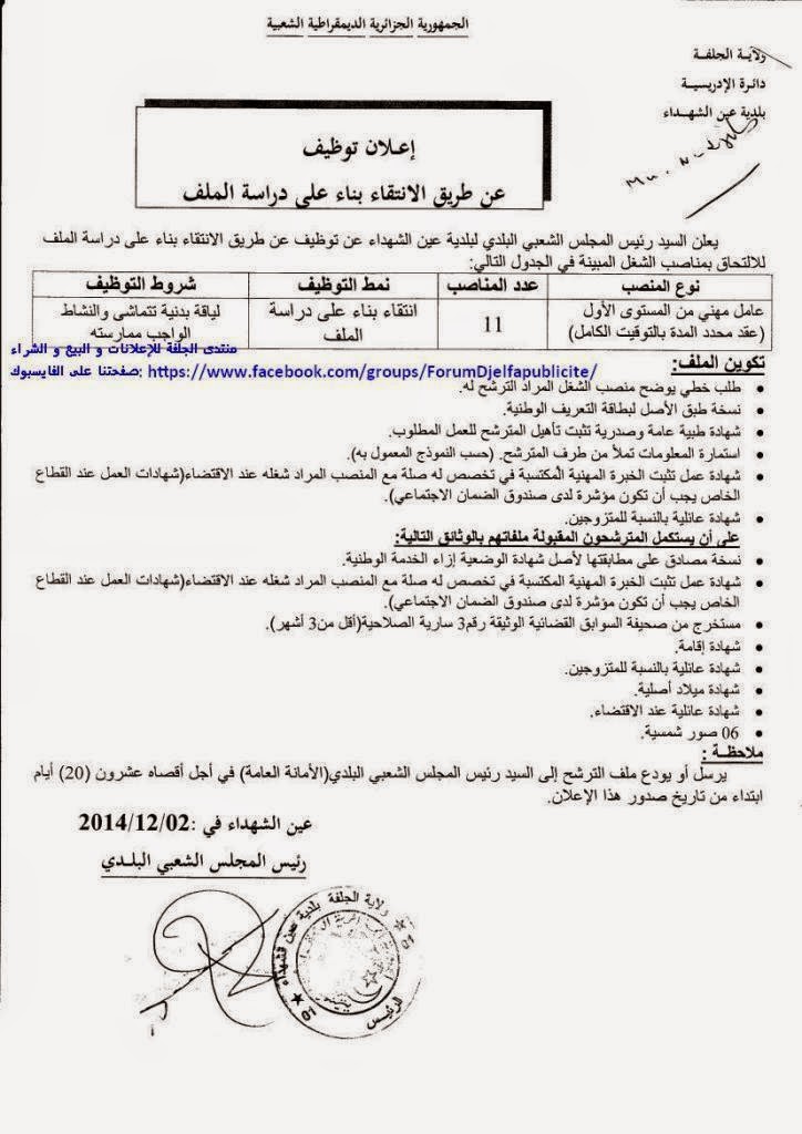 إعلان توظيف ببلدية عين الشهداء دائرة الإدريسية ولاية الجلفة |