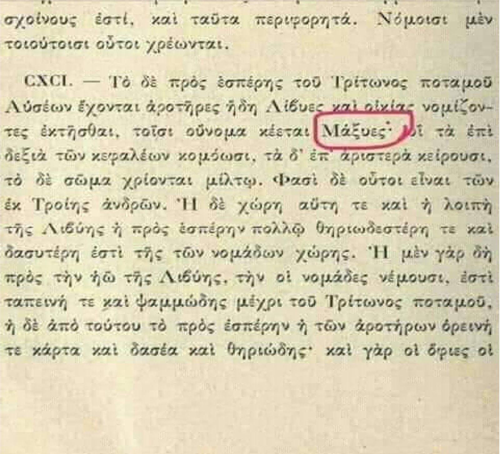 وثيقة مهمة جدا باللاتينية الاغريقية (اليونانية) للمؤرخ هيرودوت يتحدث فيها عن سكان شمال افريقيا الأصليين الأمازيغ ويذكر أنهم يطلقون على أنفسهم شعب الأمازيغ ، ليأتي اليوم أشباه المؤرخين خريجي المدرسة القومجية الاعرابية العفلقية - ويستحمرون الناس بتزويرهم للتاريخ ويدلسون على التاريخ المغاربي وعن الامازيغ بالقول انها تسمية جديدة اخترعها الامازيغ المتشددين اوكما يسمونهم البربريست