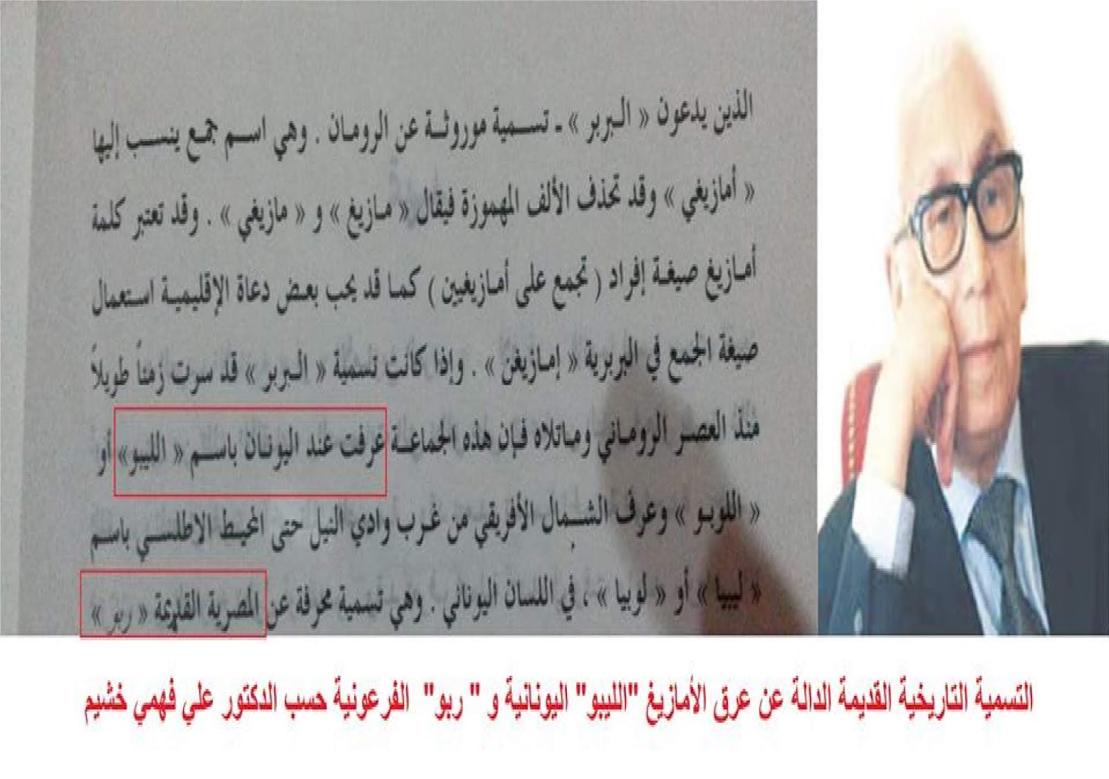 و لمن يريد أن يعرف أقدم تسمية للأمازيغ الدالة على عرقهم دون سواهم ، أقدم لكم شهادة الدكتور علي فهمي خشيم رأس حربة البعثيين و العروبيين في شمال أفريقية و الذي لم يتوانى قط عن استعمال مصطلح " الامازيغ" ( التسمية العلمية الصحيحة) مبينا أن اسمهم القديم المستعمل من قبل اليونان هوا " الليبو" أو " اللوبو" حيث كانت شمال أفريقية تسمى بليبيا من غرب النيل الى المحيط الأطلسي و قبلهم أطلق المصريين القدامى على الأمازيغ تسمية " ربو" .