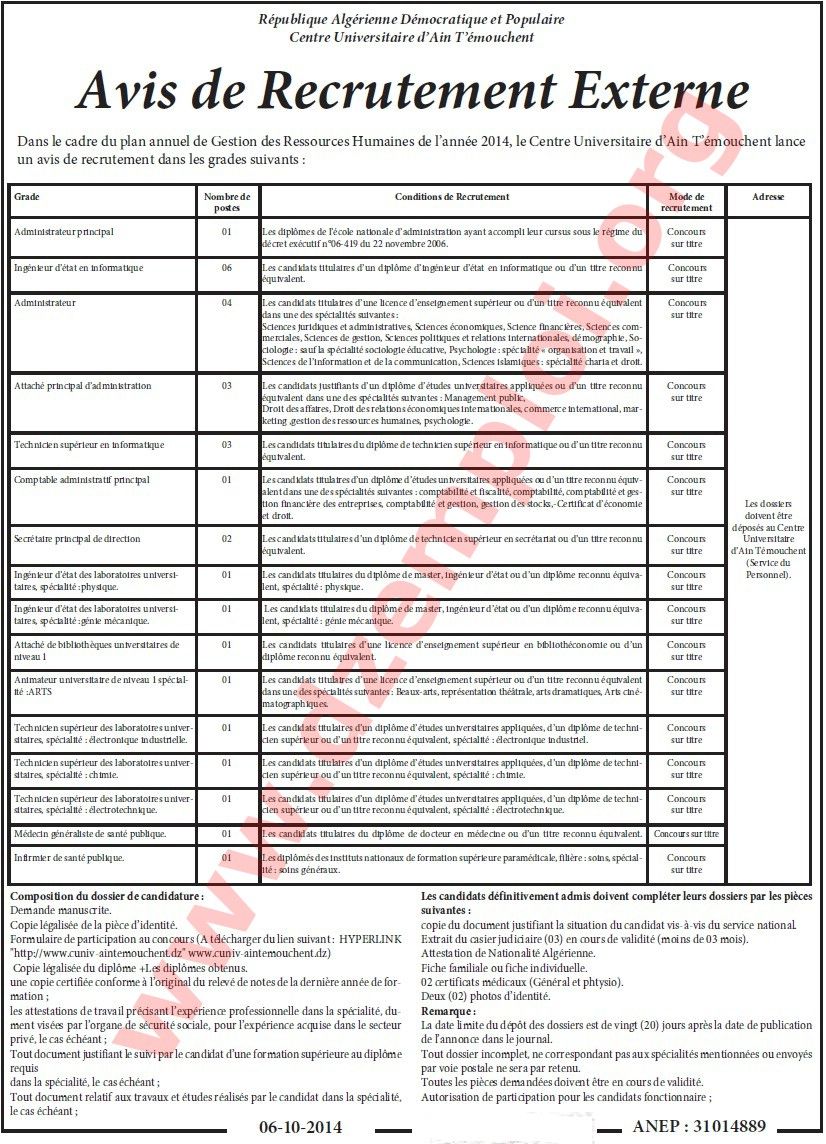 توظيف في المركز الجامعي لولاية عين تيموشنت |