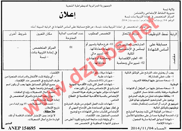 المركز المتخصص في إعادة التربية بنات بتبسة آخر تعديل nadoush.1984 2014-11-08 في 21:33.