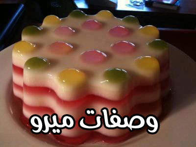 المقادير باكيت جيلي بطعم الفراوله باكيت جيلي بطعم الموز باكيت جيلي بطعم البرتقال باكيت جيلي لونه أخضر أربع ملاعق قشطه أربع ملاعق زبده أربع أكواب ماء طريقة التحضير ضعي باكيت جيلي الفراوله في الخلاط مع كوب ماء و ملعقة زبده و ملعقة قشطه و شغلي الخلاط لمدة ربع ساعة ثم صبي الخليط في صينية بايركس متوسطة الحجم و دعيه في الفريزر حتى يجمد اعملي الباكيت الثاني بنفس الطريقة و هكذا حتى تتشكل لديك اربع طبقات كل طبقه عباره عن لونين الأعلى فاتح و الأسفل غامق من الجلي اتركي القالب في الثلاجة حتى يجمد ثم يقدم |