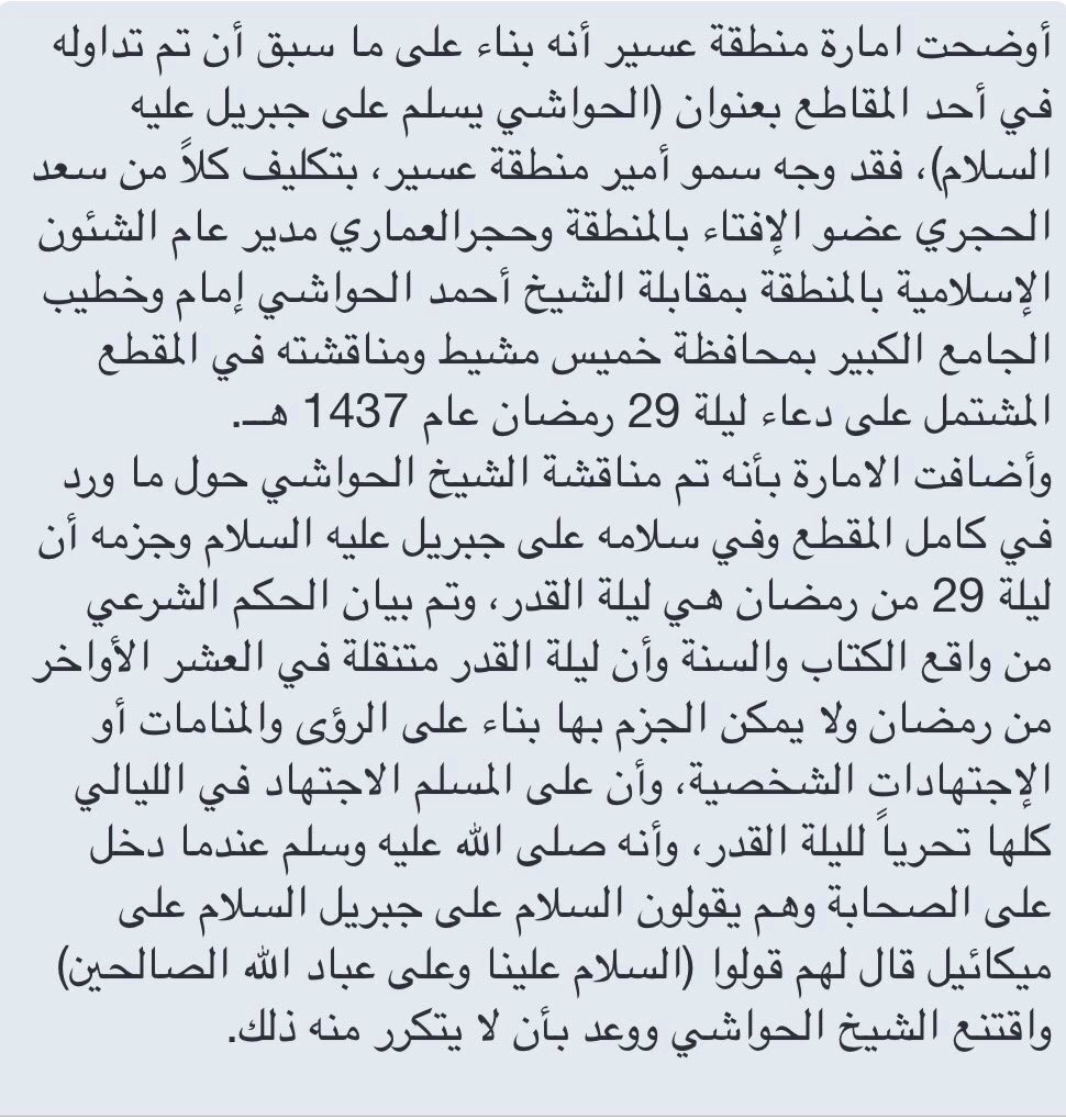 رجل دين سعودي نصاب زعم انه التقى سيدنا جبريل وسلم عليه ... وبالمرة يمكن عمل لايك لصفحة جبريل على الفيسبوك ادعى إمام وخطيب الجامع الكبير في مدينة خميس مشيط السعودية رجل الدين النصاب أحمد الحواشي، أن سيدنا جبريل (س) شاركه صلاة القيام في ليلة 29 من رمضان الماضي مع جمع من الملائكة وجزم بأنها كانت ليلة القدر، بحسب صحيفة الوطن السعودية ولم يذكر النصاب ان كان قد عمل ( لايك ) لصفحة جبريل على الفيسبوك ام لا وكان الحواشي حيا في دعاء القنوت جبريل (س) مرات عدة مخاطبا في الدعاء بـ "سلام الله عليك يا جيريل ورحمة الله وبركاته سلام الله عليك ياسفير السلام ... سلام الله عليك يا من شاركتنا قيامنا أنت ومن معك من ملائكة ربنا ..." !وكانت مواقع التواصل الاجتماعي تداولت مقطع الفيديو حول دعاء الحواشي على نطاق واسع الامر الذي لاقى ردود افعال عديدة، الامر الذي دفع إمارة منطقة عسير إلى إصدار بيان أوضح فيه أنه تم استدعاء احمد بن محمد الحواشي ومناقشته في المقطع المشتمل على دعاء ليلة 29 رمضان عام 1437، ووعد الحواشي بألا يتكرر منه ذلك . |