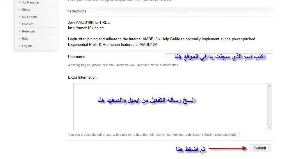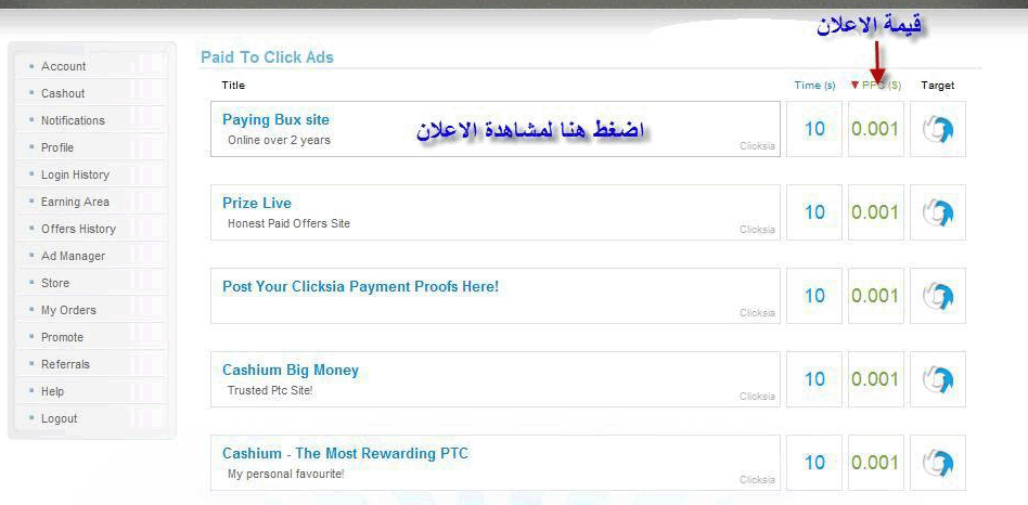 شركة Clicksia.com هي من الشركات ذات ثقة ومصداقية كبيرة على الأنترنت فالشركة في الاصل قائمة على العروض لكن فيها اعلانات كثيرة ممكن تكسب 4 سنت من الضغط على الاعلانات يوميا اما العروض ما بين 10الى 20 سنت والحد الادنى دولار واحد تقدر تعمله بسهولة ومدة الدفع من 1-7ايام لكن على الأغلب تدفع في اليوم التالي . وهذا إثبات دفع من الشركة على بنك payza [ alertpayسابقا ] : 1- مميزات الشركة : 1- من 8-12 اعلان يوميا . 2- عروض كثيرة مابين 10- 20 سنت. 3- تقبل Payzaو paypal. 4- حد ادنى 1 دولار والدفع كما ذكرت شبه فوري. 2- طرق الربح من الشركة : يوجد في الشركة 4 طرق للربح منها وسوف أذكرها في مايلي : الطريقة الاولى : وهى عن طريق الضغط على الاعلانات وتربح من 0.001 الى 0.002 سنت عن كل اعلان ومدة الانتظار تتراوح من 10 الى 50 ثانيه وعدد الاعلانات 44 اعلان يوميا . الطريقة الثانيه : وهى عن طريق التسجيلفى المواقعوتربح من التسجيل من 10 إلى 20 سنت . الطريقة الثالثة : وهى عن طريق زيارة المواقع وكتابة فكرتك عن كل موقع قمت بزيارته وهي طريقة مربحة جيداااا . الطريقة الرابعة : وهى خاصه باصحاب المواقع وهي أيضا مربحة لمن يمتلك موقع على الأنترنت أو مدونة . . . طريقة أخرى للربح من الشركة : وهي عن طريق دعوة أصدقائك للتسجيل عن طريق رابط الدعوة الخاص بك فتربح عن كل شخص 10 % من أرباحه في الشركة . ملاحظة مهمة حول الشركة : الحد الادنى لسحب ارباحك هو 1دولار على بنوك Payza و Paypal ويتم الدفع فى خلال 7 ايام لكن الشركة تدفع في يوم واحد و7 أيام هي اقصى حد لإنتظار الدفع 3- طريقة التسجيل في الشركة : أولا نضغط على الرابط التالي : ثم نتابع الشرح بالصور : والآن بعدما قمنا بالتسجيل في الموقع راح نذهب إلى البريد الإلكتروني الذي سجلنا به في الشركة وراح نلاقي رسالة لتأكيد الإشتراك في الشركة نفتحها ونضغط على رابط تأكيد التسجيل لاحظ الصورة التالية : وهكذا نكون قم إنتهينا من شرح التسجيل في الموقع وتأكيد الإشتراك الآن نسجل الدخول إلى الشركة لاحظ الصور : راح تظهر هذه الصورة بعد تسجيل الدخول في الشركة تبين شرح شامل للشركة وطرق الربح منها وكيفية تغير بياناتك الشخصية وتسجيل الخروج من الشركة : الآن راح نشرح كيفية الضغط على الإعلانات في الشركة تابع معي الصور : ونعيد التجربة على كل الإعلانات يوميا ... الآن نشرح طريقة الربح من العروض تابع معي الصور : بعد الضغط على رابط الموقع راح نقوم بالتسجيل في الموقع ثم يرسل الموقع الذي سجلنا به رسالة إلى البريد الإلكتروني المسجل به في الموقع إنسخ محتوى الرسالة بدون جزء الباس واليورز وضعه في المكان المناسب لاحظ الصورة : إنتهينا من شرح طريقتين للربح من الأنترنت سنكتفي بذلك لانها تعتبر أفضل طرق الربح من شركة Clicksia.com الحد الأدنى للحساب وهو 1 دلاور كيف لي أن أحول أموالي إلى حسابي في البنك الإلكتروني الخاص بي أولا يجب أن يكون لديك حساب فيPaypal أو Payza Clicksia.com إلى حسابك في Paypal او Payza : التحويل سهلة جداا كل ماعيك فعله هو وضع البريد الإلكتروني الخاص بالبنك الإلكتروني الذي تريد التحويل إليه وتضغط على زر Cashoutوبهذا أكون قد إنتهيت من الشرح المفيد والسهل لشركة Clicksia.com