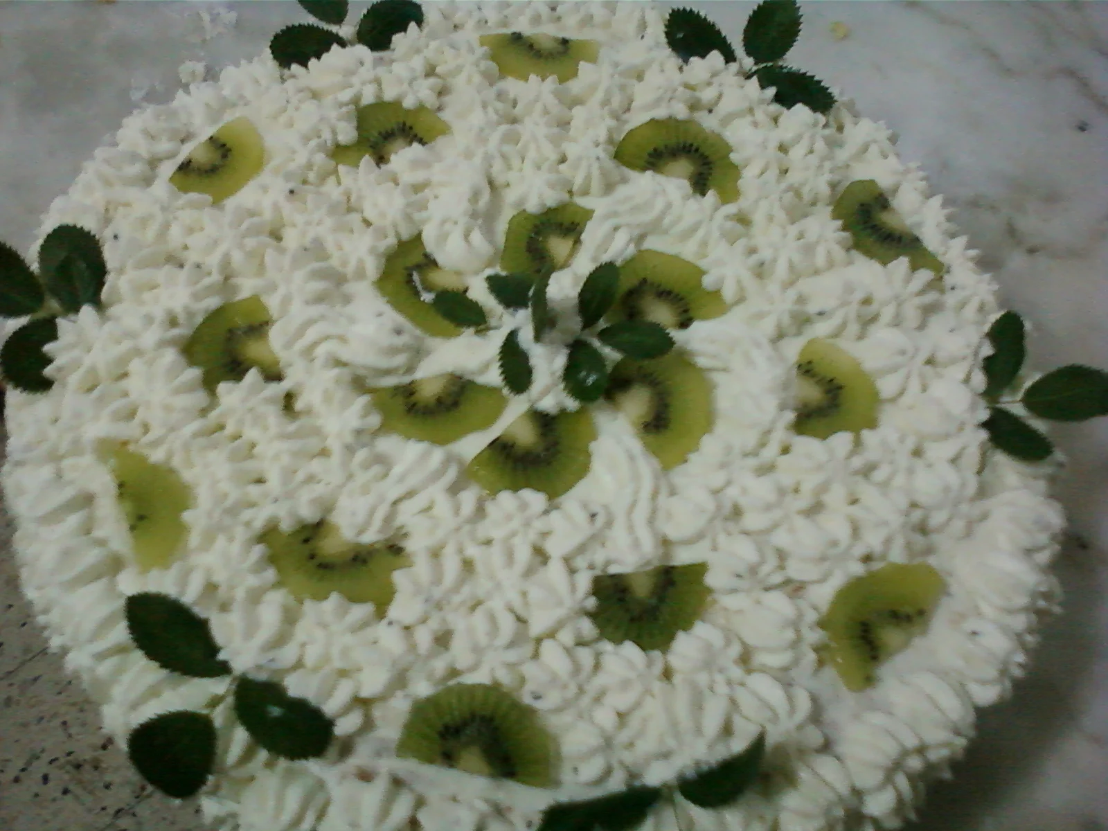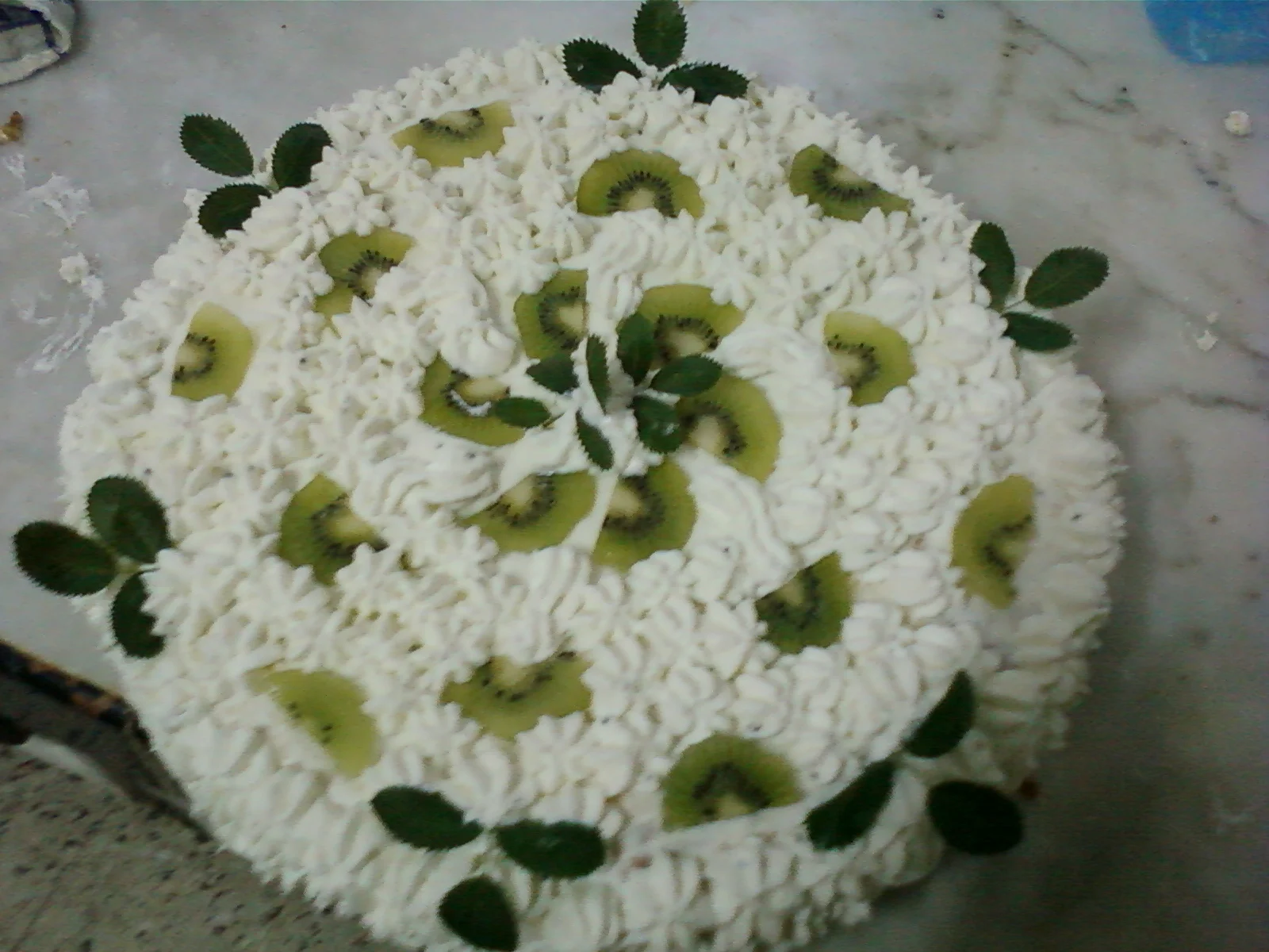 و هاذي درتها لعيد ميلاد زوجي ربي يحفظو و يعيشو ليا و الأولاد أولا التارت فيها 2 قرصات ، مقادير القرص الواحد هي: * 5 بيض *125غ سكر عادي *60غ فرينة *65غ نشاء *1 خميرة القاطو *قشور الليمون الطريقة: في خلاط كهربائي نطلع بياض 5 بيضات+125 سكر كالثلج، بعد ذلك نضيف 5 صفار و نخلط بهدوء باش مايهبطش البياض+ **فرينة+نشاء+خميرة** مغربلين باش يدخل الهوا و نخلط برفق حتى نتحصل على خليط متجانس ثم نفرغه في مول مدهون بالزبدة و مرشوش بالفرينة و نطيبها مثل المسكوتة أي نار هادئة و الفرن لا نفتحه أثناء الطهي و نتركها حتى تصبح ذهبية اللون و نخليها تبرد *** نعيد الكرة و نخدمو القرصة الثانية و نخليوهم يبردو بعد ذلك كل قرصة نقسمها على 2 من الوسط فبذلك نتحصل على 4 قرصات تحضير الكريمة: بعيدا عن النار نخلط في كسرونة: 1 لتر حليب+6 صفار بيض+6 م ك نشاء+1 م ك زبدة+سكر عادي حسب الحلاوة "كل واحد يدير على حساب الذوق" ثم نضعها عل النار و نحرك لكي لا تلتصق حتى تصبح كثيفة ثم نبعدها عن النار و نضيف عصير و برش ليمونة و نتركها جانبا حتى تبرد أثناء ذلك نحضرو الكريما نبداو نسقيو الطبقة الأولى بالشاربات بارد ثم ندهنها بالكريمة ثم نقطع حبة موز من فوق ثم نضع فوقها الطبقة الثانية و هكذا حتى نصل إلى الطبقة الرابعة و الأخيرة ندهنوها بالكريمة طبقة خفيفة فقط بعد ذلك نحضر la crème chantilly بخفق 200 غ غبرة الشونتيي+2 كيسان حليب بارد جدا حتى تصبح كثيفة ثم ندهن التارت كامل بالشونتيي حتى تتغطى ثم نعمر كيس الحلواني و نبدأ التزيين أتمنى أن ينال التارت إعجابكم