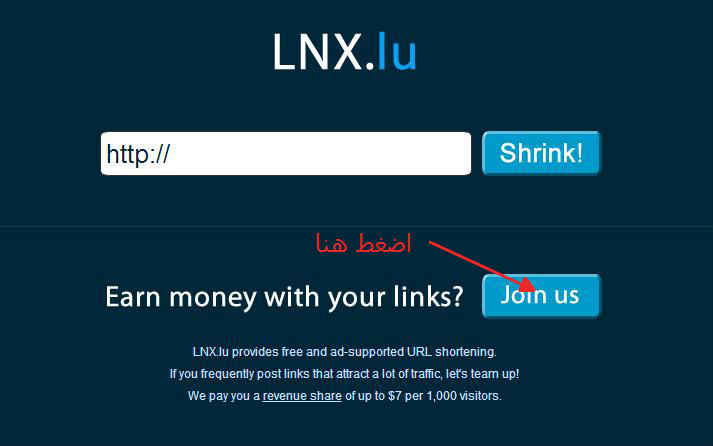 موقع LNX.lu هو أحد مواقع إختصار الروابط والتى تم إنشائها بهدف الربح من النت حيث تربح عن طريق زيارة الروابط الخاصة بك؛ حيث يتم عرض بعض الإعلانات لمدة 5 ثوانى فقط وبعدها يتم تحويل الزائر إلى الصفحة الهدف. قم بتجربة الرابط التالى لتفهم الأمر، وهو رابط سوف يقوم بتوجيهك إلى صفحة جوجل الرابط هو : https://lnx.lu/1Aiv شرح التسجيل في الشركة LNX.lu أولا أضغط على هذا الرابط للتسجيل: ثم تابع الشرح بالصور : بعد الدخول من خلال الرابط نقوم بالضغط على Join us بعد ذلك نقوم بالذهاب الى الايميل لاتمام عملية التسجيل والضغط على رابط التحقق من امتلاك الايميل