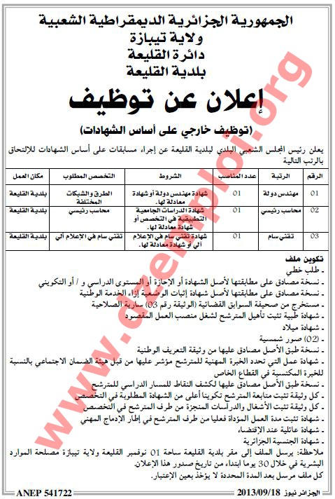 إعلان مسابقة توظيف في بلدية القليعة ولاية تيبازة سبتمبر 2013