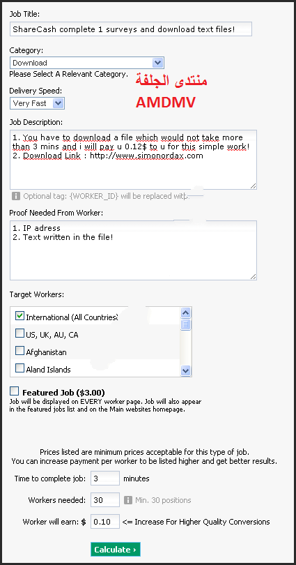 السلام عليكم ورحمة الله وبركاته شرح لفكرة الربح من موقع شيركاش ShareCash الفكرة تعتمد بالأساس على استعمال موقع شيركاش مع أحد مواقع الخدمات المصغرة والفكرة واضحة أخي .. ترفع ملفا على شيركاش و عوض أن تبحث عن زوار له لكي تربح .. تستعمل موقع الخدمات المصغرة الذي دركته في التدوينة .. وكل شخص قام بتحميل ملفك ستربح منه .. لكن في نفس الوقت ستعطيه 0.10$ مقابل عملية التحميل التي قام بها ولكي تتأكد أنه حمل الملف يجب أن يرسل لك في رسالة التأكيد .. ماهو مكتوب داخل ملفك و كذلك Ip الخاص به لكي لا يتكرر التحميل أكثر من مرة. الربح من شيركاش - ShareCash 1. التسجيل في موقع شيركاش - ShareCash كمرحلة أولى و قبل أن ندخلَ في التفاصيل يجب أن نتوفر على حساب في موقع شيركاش - ShareCash يمكنكم التسجيل عن طريقي بالظغط على الصورة ![]() ستظهر لك خانة معلومات التسجيل و هي كالآتي : 2. إعداد الملف الذي سنرفعه على موقع شيركاش - ShareCash هنا وبعملية جد بسيطة سنقوم بانشاء ملف نصي بصيغة .txt ونكتب داخله أي شيء نريده، مثلا أنا سأكتب داخل الملف "إنضم إلى مجموعتي في الفيس بوك هذا رابطها www.********.com/alkitabpdf" أكتب أي شيء تريد .. و يمكنكم التحكم كما تريدون في نوعية الملف الذي سترفعونه ليتم التحميل عن طريقكم من موقع شيركاش - ShareCash 3. الأن نقوم بالتسجيل في موقع للأعمال المصغرة تقوم بالتسجيل من هنا onlinemicrojobs.com عندما سننهي التسجيل (التسجيل عادي مثل جميع المواقع) ندخل إلى حسابنا .. سيمنحنا الموقع 1$ متاح للإستعمال إذا أردنا إنشاء حملة تحميل لملفنا الذي رفعناه في موقع شيركاش - ShareCash ربما سيطرح بعضكم الآن سؤالا قائلا " كيف يمكنني إنشاء حملة لملفي الذي رفعته على شيركاش ؟ " قبل أن نقوم بشرح الطريقة .. يجب أن تعلمو أن مبلغ 1$ الذي يمحنه لك الموقع غير كافي للإنشاء حملة لملفنا .. لذلك وجب علينا أن نختار بعض الأعمال السهلة داخل الموقع لنقوم بها ونرفع المبلغ إلى 5$ أو يمكننت رفعه بطريقة أسهل وهي الأت Refer وهي ان نسجل أشخاص بالموقع عن طريقنا .. هذا إن لم يكن في استطاعتكم توفير المبلغ قد يستغرق منكم جمع مبلغ 5$ داخل في الموقع أكثر من 48 ساعة، لكن اعلمو أن الأمر يستحق هذا التعب تابع معي الى النهاية. لماذا يستحق ؟ لأنكم عن كل استشمار لـ 5$ لملفكم، ستتحوّل إلى 25$ كأقل مبلغ ستحصلونَ عليه إذا حصرنا القيمة التي ستربحونها في 0.4$ عن كل شخص قام بتحميل ملفكم ( وعلى فكرة .. هذه أدني قيمة ستحصلون عليها عن كل تحميل، وقد تصل إلى 10$ إذا كان الشخص الذي حمّل الملف من أحد الدول الغنية والمتقدمة ). 4. إعدادات الخدمة التي سننشأها في موقع onlinemicrojobs.com بعد بلوغنا مبلغ 5$ الذي سنستثمره في عمليات التحميل .. يجب أن ننشأ خدمة جديدة للعملية ولذلك نذهب إلى Employers تم Create New Job كما تظهر الصورة التالية سوف تضهر لنا هذه الصفحة سنقوم بملئها وهي سهلة كتوضيح فقط ! في هذه إعدادات Job Description نخبر أن من سيقوم بتحميل ملفنا النصي عليه أن يرسل لنا الـ IP الآيبي الخاص به و ماهو مكتوب داخل ملفك النصي .. حتى نتأكد من أنه حمل الملف و أنه لن يعيد تحميله مرة أخرى. في مكان رابط مدونتي يجب أن نضع رابط الشيركاش لملفنا النصي .. أي الرابط الذي سيحمل منه المستخدم الملف الخاص بنا. بعد الإنتهاء .. والموافقة على خدمتك ستظهر في واجهة الموقع بالشكل التالي كإضافة اخرى .. يمكنك استغلال فكرة هذا الموقع onlinemicrojobs.com في الـ Refer لمواقع مختلفة و كذلك لعروض الـ CPA المختلفة و خصوصا عروض التسجيل و تحميل البرامج والملفات . وبهاذا أكون قد أنهيتُ الشرح .. اذا لم تستوعب أي شيء ضع رد في الأسفل لأقوم بتوضيحه شكرا ![]()