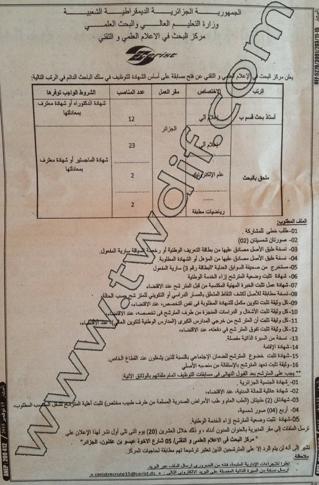 إعلان عن توظيف بمركز البحث في الاعلام العلمي والتقني نوفمبر 2015 (39 منصب )