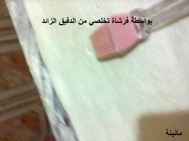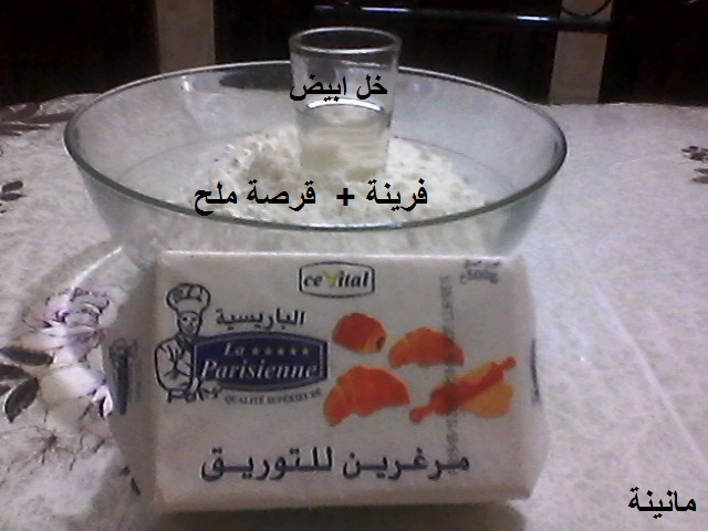 بسم الله والصلاة على رسول الله السلام عليكم 1. 500 غ فرينة ''دقيق'' 2. ماء بارد 3. ½ كاس شاي خل ابيض 4. قرصة ملح 5. 375 غ زبدة التوريق 6. 2 ملاعق اكل نشا طريقة التحضير: 1. نعجن الزبدة مع النشا . 2. نخلط الفرينة + الملح + الخل . 3. نعجن الخليط " الفرينة + الملح + الخل " بالماء البارد . 4.نضع الزبدة وسط العجينة . 5.نجمع الاطراف الاربعة للعجينة حتى نغطي الزبدة . 6.نحل العجينة باتجاه الطول بدون الظغط عليها حتى لا تتسرب الزبدة خارج العجين. 7.ناخد العجينة بعد فردها باتجاه العرض نضع الطرف الاول في الوسط ثم نضع الطرف الثاني فوق الطرف الاول . 8.نضع العجينة في الثلاجة لترتاح 15 د . 9.نحل العجينة ونضع الطرف الاول في الوسط ثم نضع الطرف الثاني في الوسط و نضع الطرف الثاني فوق الطرف الاول لنحصل على 4 طبقات . 10.نكررهذه العملية 3 مرات وفي كل مرة نترك العجينة في الثلاجة لترتاح 15 د . 11.وتصبح العجينة جاهزة للاستعمال . ملاحظات : 1. تكون الزبدة بدرجة حرارة المطبخ . 2. ادا تمزقت العجينة وتسربت الزبدة نضع قطعة عجين"دقيق +ماء " لغلق المكان . 3 .كمية الماء حسب نوعية الدقيق . 4. اذا زاد عدد الدورات عن العدد المطلوب سيتم حرق التوريق . 5. اما نعمل 4 دورات مزدوجة او نعمل 3 دورات مزدوجة مع 1 دورة واحدة عادية . 6. الدورة العادية تسمى ب tour simple. 7. الدورة المزدوجة تسمى ب .tour double