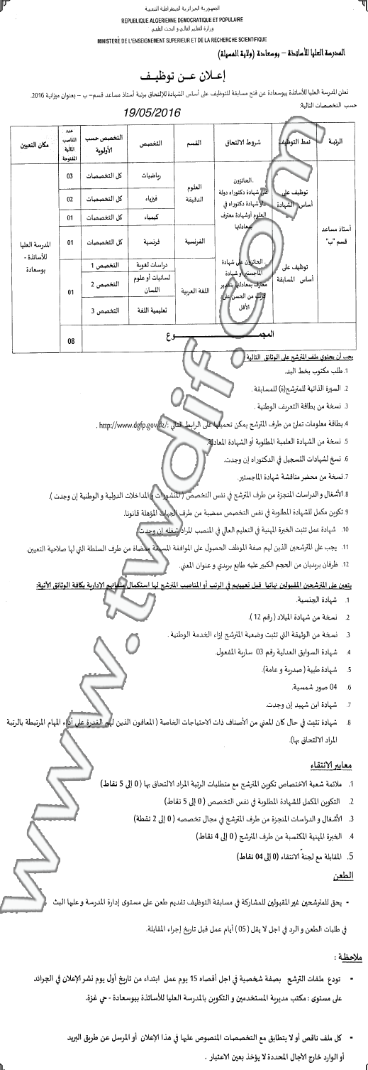 أعلان المدرسة العليا للاساتذة ببوسعادة ولاية المسيلة