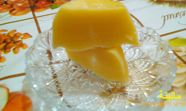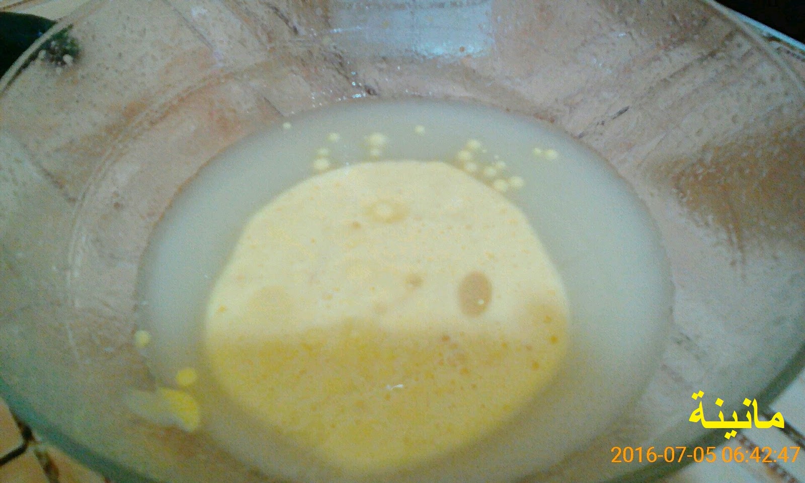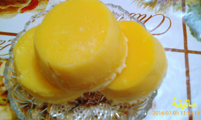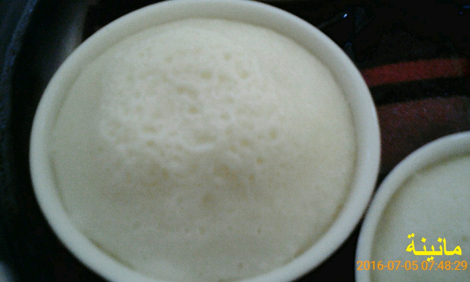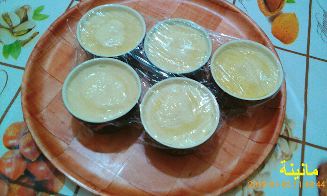 بسم الله والصلاة على رسول الله السلام عليكم 1. 150غ ماء 2. 150 غ زيت 3. 160 غ حليب بودرة 4. 3قطع جبن 5. 3 صفار بيض 6. 40غ نشا 7. ملح 8. عصير ليمونة طريقة التحضير: 1. نخلط الماء مع الزيت جيدا حتى يصبح الخليط ابيض. 2. نضيف الصفار. 3. + قطع الجبن مع الخلط الجيد . 4. + الملح + النشا + عصير الليمون. 5. + الحليب على مراحل حتى تتجانس المقادير مع بعض . 6. ناخد قوالب فردية ندهنها بالزيت . 7. نفرغ الخليط في القوالب . 8. نضعها داخل طاجين واسع فيه ماء ساخن وفوطة . 9. نغلق الطاجين . 10. لما يغلي الماء نجعل النار هادئة . 11. يترك لمدة 45 د. 12. نتركه يبرد تماما ثم ندخله الثلاجة . 13. لما يبرد نفرغه من القوالب . 14. في حالة عدم استعماله خلال 20 يوم نقوم ببشره ووضعه في اكياس والاحتفاظ به في المجمد الى حين الاستعمال.