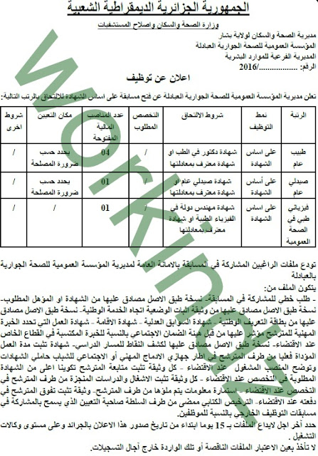 إعلان التوظيف بالمؤسسة العمومية للصحة الجوارية العبادلة ولاية بشار جانفي 2017