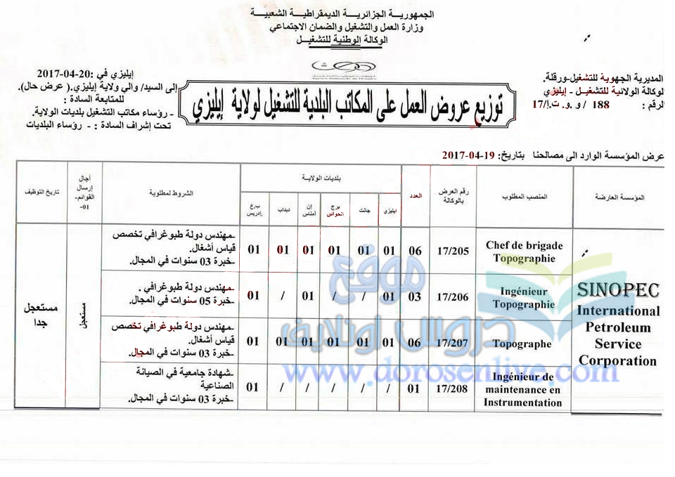 إعلان توظيف 263 منصب في شركة سينوباك للبترول بشكل مستعجل بولاية إليزي أفريل 2017 للتقدم لهذه المناصب يرجى التقرب من الوكالة الولائية للتشغيل إيليزي أو وكالات التشغيل المحلية المعنية المناصب المفتوحة المصدر إعلان توظيف 263 منصب في شركة سينوباك للبترول بشكل مستعجل بإليزي أفريل 2017